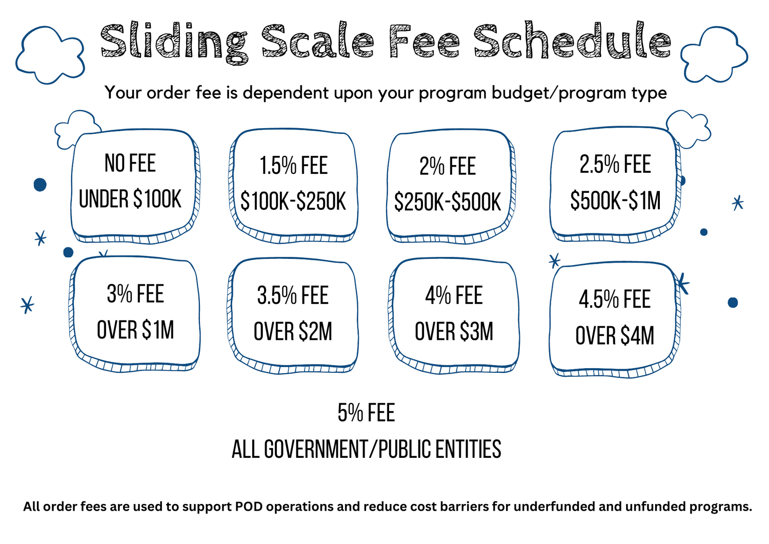 POD makes no profit from the sale of the supplies we offer, however we do add a sliding scale margin (from 0% to 5%) based on the size of your program’s budget to offset the cost of shipping and handling.